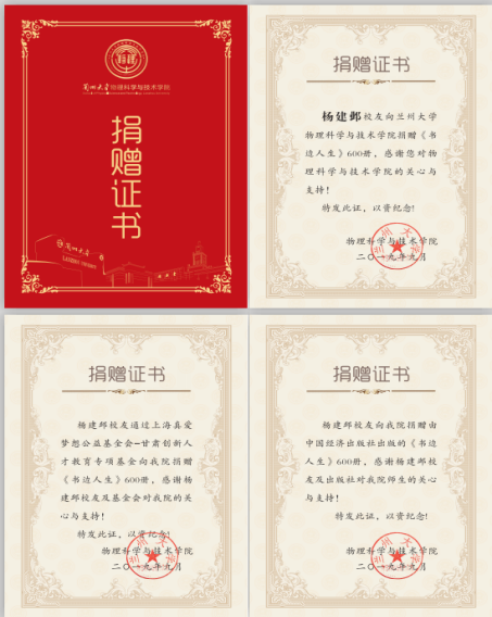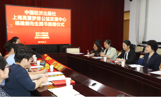 9月11日上午,我院校友、华中科技大学退休教授杨建邺先生委托中国经济出版社、上海真爱梦想公益基金会-甘肃创新人才教育专项基金向学院捐赠《书边人生:出书记》600册,献礼兰州大学110周年校庆。甘肃专项基金发起人龚阿玲、出版社编辑姜静、学院副院长李星波、图书馆副馆长宋戈、档案馆副馆长陈艳出席捐赠仪式。