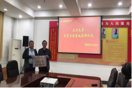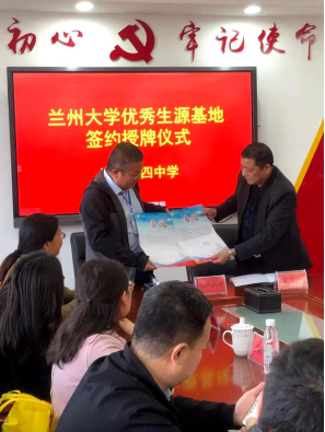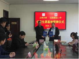 此次活动中,两位老师代表兰州大学分别向五所中学授予了“兰州大学优秀生源基地”的牌匾,同时签署了相关的合作协议。至此,兰州大学在山东省的优秀生源基地中学数量达到了50余所。在淄博四中和淄博实验中学两位老师还向对方学校带去了兰州大学的喜报,祝贺两所中学2020年都有多名学子考入兰州大学。