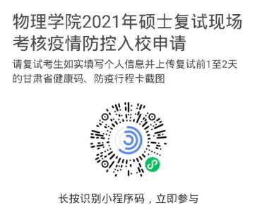 疫情防控期间,参加现场复试的考生请在复试报到前1~2天扫描以下统计助手二维码,如实填写个人复试信息,上传甘肃省健康二维码“绿码”、通信大数据防疫行程卡截图,向学院提交入校申请,待学院审批通过后方可刷本人身份证入校,未经批准不得私自来校(学院仅对审批不通过的考生进行电话通知)。