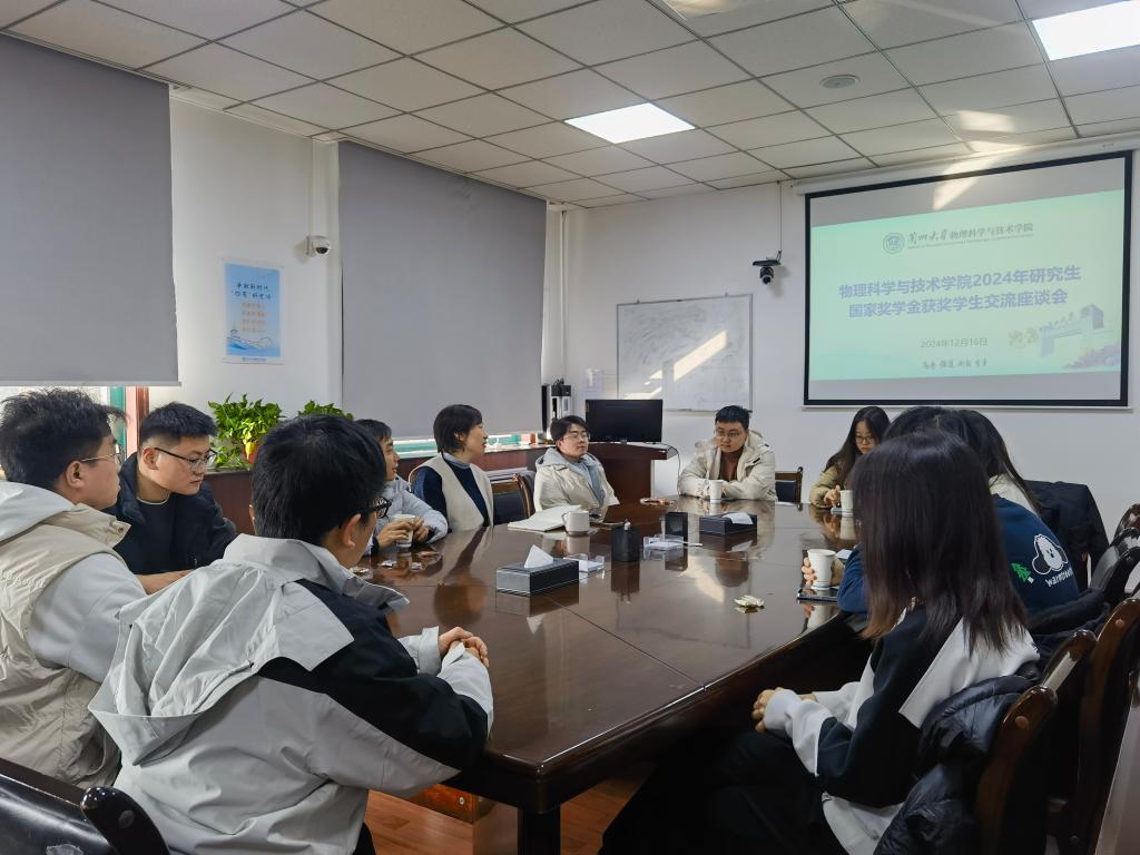 2024年12月16日,物理科学与技术学院在格致楼4022会议室召开了研究生国家奖学金获奖学生交流座谈会。会议由学院研究生会组织,辅导员王昀主持,辅导员张晓晓和国家奖学金获奖学生代表参加了会议。