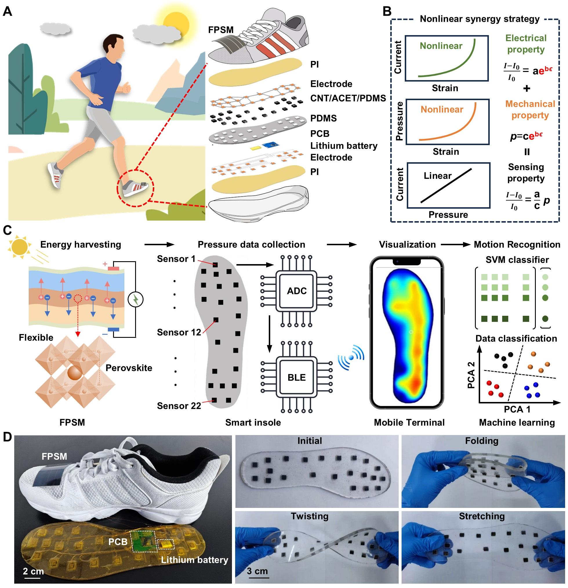 该智能鞋垫由多层结构组成,包括封装层,上下电极,碳纳米管/乙炔黑传感层,PDMS支撑层和嵌入在其中的印刷电路板组成。贴附在鞋子顶部的柔性钙钛矿太阳能电池模组,将太阳能转换成电能并储存在锂电池中,为智能鞋垫持续供能。双非线性协同策略的采用,降低了数据处理复杂度,并提升了稳定性和测量精度。采集到的高质量传感数据,蕴含了丰富的人体运动特征,因此能够通过机器学习模型加持,以低数据集输入的情况下,实现多状态和高准确率的识别。