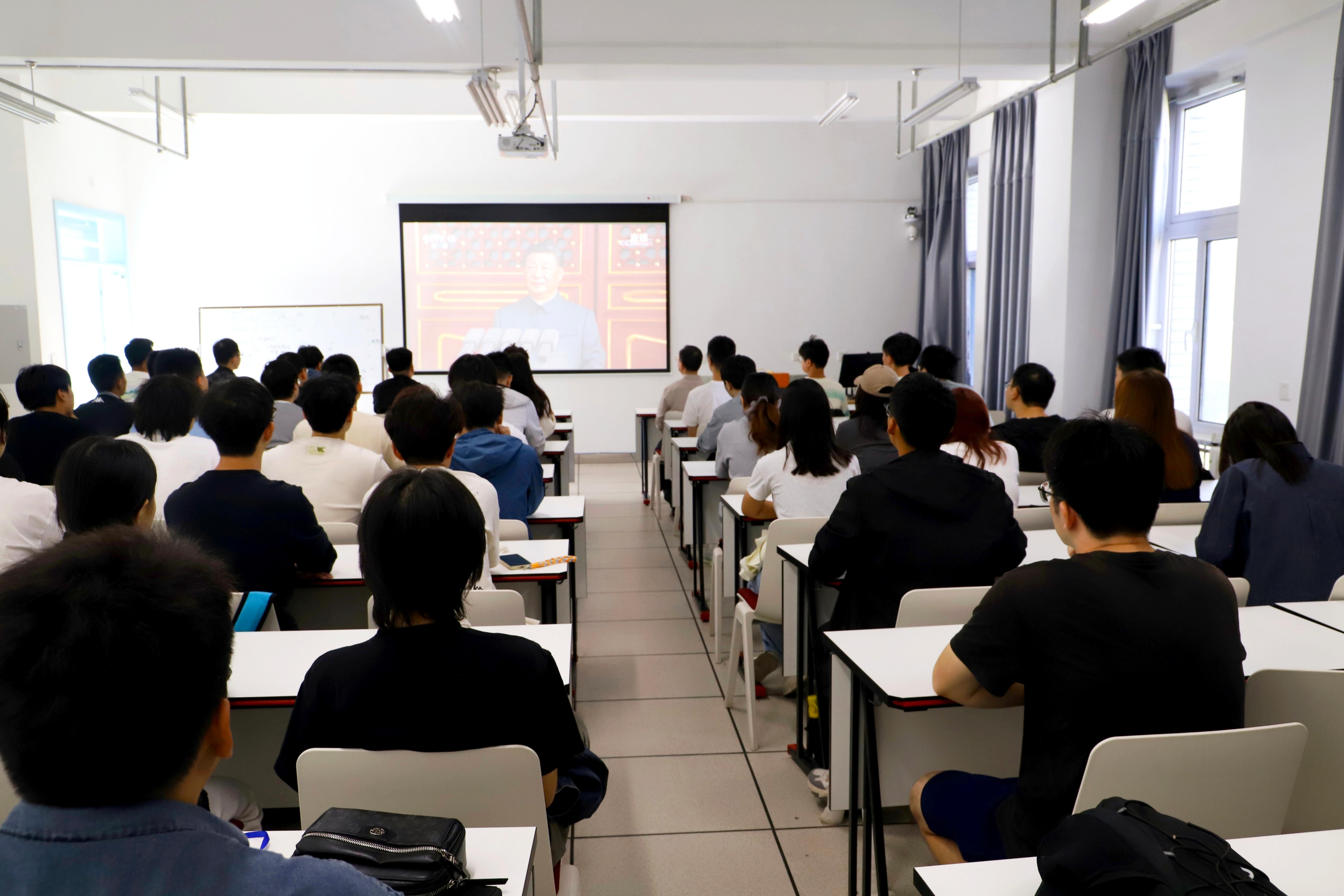 9月3日上午,纪念中国人民抗日战争暨世界反法西斯战争胜利80周年大会在京举行,中共中央总书记、国家主席、中央军委主席习近平发表重要讲话并检阅部队。物理学院组织师生在两校区集中收看大会直播,大会在学院师生中引发热议。