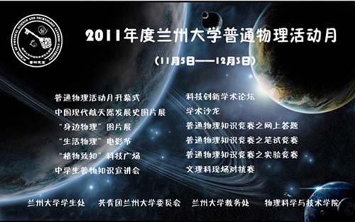 本次的普物活动月系列活动得到了校团委、学生处、教务处的大力支持,也得到了西北民族大学电气工程学院的协助,活动从10月25日开始,将持续到12月3日结束。活动内容十分丰富,包括物致知科技广场、中国航天器发展史图片展、普通物理知识有奖竞答、科技创新学术论坛、学术沙龙、身边的物理图片展、生活中的物理电影节、笔试竞赛、实验竞赛、团体对抗赛以及中学生普物知识宣讲会等十余项内容,将把物理广袤而深邃的世界一并展现给大家,并使同学们亲身感受身边的物理带给我们的无限乐趣。