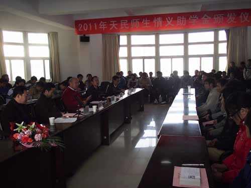 11月29日下午,2011年度“天民师生情义助学金”颁发仪式在榆中校区办公楼二楼会议室隆重召开。“天民师生情义助学金”的设立者,北京航空航天大学博士生导师王天民教授、物理学院党委书记杨毅、副院长刘映琦和助学金捐资人兰州大学第二医院王贵祥出席了颁奖大会。会议由院党委副书记王斌主持。