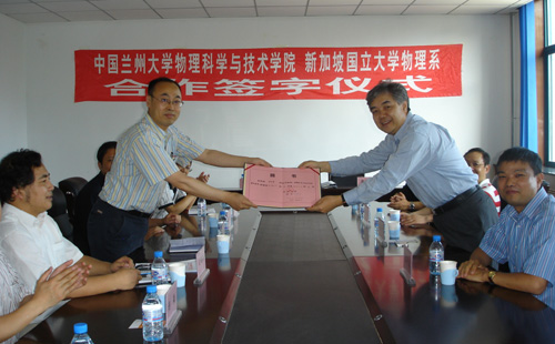 我校与新加坡国立大学有着长期的友好合作关系,2007年初,我校常务副校长李廉、研究生院常务副院长贺德衍、开云online(中国)院长薛德胜等多次赴新加坡国立大学进行沟通,2007年10月9日,我校与新加坡国立大学共建先进功能材料实验室揭牌暨合作签字仪式在我校隆重举行。兰州大学副校长徐生诚,各机关处室领导,学院全体领导,新加坡国立大学材料科学与工程系系主任周经武以及该系的丁军、陈景升博士出席了签字和揭牌仪式。此次新加坡国立大学物理系系主任冯元平教授来访主要涉及双方科研合作、研究生培养和外事交流等。
