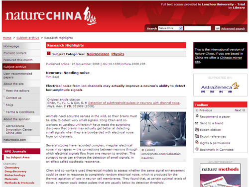 近日,我院陈勇副教授与其博士研究生俞连春等共同合作的研究论文《Detection of subthreshold pulses for neurons with channel noise》在Physical Review E发表以后,被国际权威期刊《Nature》主办的“nature CHINA”网站评为最新研究亮点。网站还为该论文撰写了题为《Neurons: Needing noise》的评论,对陈勇副教授等研究人员的研究成果进行了介绍和描述。