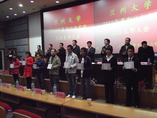 会议第二部分,表彰大会在庄严的国歌声中宣告开始。校团委书记安俊堂老师宣读了2010暑期社会实践表彰文件,并公布了优秀团委、优秀团队、先进个人、优秀指导教师、优秀队员、优秀论文获奖名单。由主席台上各位领导嘉宾为获奖者颁奖。我院团委荣获2010年度兰州大学社会实践优秀组织奖,学院社会实践团队兰州大学赴东北老工业基地--辽宁省知名企业参观调研社会实践团获得2010年兰州大学暑期社会实践优秀团队,谢二庆老师获得2010年兰州大学暑期社会实践优秀指导教师,院团委书记陈洁老师获得2010年度兰州大学社会实践先进个人,2008级物理学张龙等30名同学获得社会实践优秀队员称号,《探讨我国高等教育改革与大学生的关系——兰州大学赴高校课程设置调研社会实践团》获得社会实践优秀论文。
