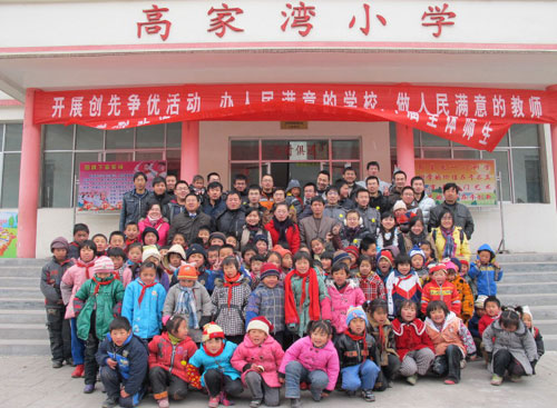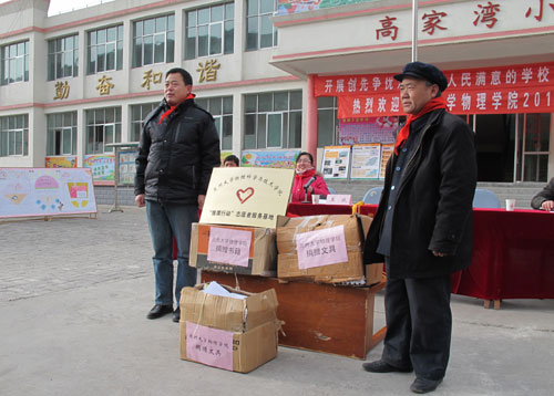 12月15日上午,我院2007级毕业生党支部全体党员和学院青年志愿者代表,冒着严寒,奔赴榆中县银山乡高家湾小学,举行爱心捐助活动及“雏鹰行动”青年志愿者服务基地揭牌仪式。出席此次揭牌仪式的有我院党委副书记王斌,团委副书记傅丽萍,榆中县银山乡学区校长张正翔,银山乡高家湾党支部书记高成继,高家湾小学校长代建商,揭牌仪式由银山乡学区校长张正翔主持。