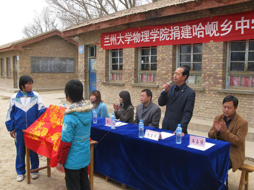 14时许,哈岘乡中学“‘阳光计划’图书阅览室”揭牌仪式正式开始。首先由哈岘中学的朱吉军校长致欢迎词,之后,物理学院志愿者马天琼同学代表全体志愿者进行了发言,在发言中,她谈到了有关大学生对贫困山区孩子的关注和对贫苦山区教育的关注,希望社会各界人士关注贫困山区的现状并建立一种可持续发展的爱心机制。随后,榆中县哈岘乡团委书记滕志娟代表哈岘乡感谢发起和组织本次活动的兰大物理院的志愿者。最后,物理院党委副书记王斌代表学院对朱吉军校长的大力支持表示感谢,并对此次活动的意义和目的进行了说明。他强调,支援贫困山区的孩子,让大学生通过支教和社会实践等方式接触社会,了解社会都是十分有意义的。他同时强调,大学生群体是即将步入社会的群体,通过参与青年志愿者活动,增加社会阅历,更直接的了解我国的国情,磨练自己的意志,毕业后能更好的为社会服务,贡献自己的力量。同时,王斌还鼓励哈岘乡中学的孩子们,要将在艰苦环境中的求学历程当作自己人生中的宝贵财富,刻苦学习文化知识,争取更进一步的深造,最后成为祖国的栋梁。