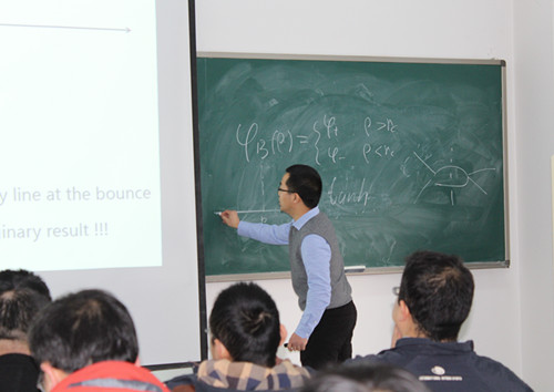 艾稳元博士首先介绍了量子场的真空衰变,即一级相变,及其在量子力学和量子场论中的区别。由于在假真空中的不稳定性,量子场会发生隧穿效应,从假真空隧穿到真真空区域。当前的研究表明,量子场的这种大量的一级相变及其在真真空区域的凝聚现象将会导致“气泡”的产生,并能够解释宇宙中正反物质的不对称性。同时,这种“气泡”的碰撞将有可能导致引力波的产生。艾稳元博士指出,通过该机制产生的引力波频段处在太极和LISA的探测范围内,因此有望在未来的空间引力波探测计划中探测到相应的信号。接着,艾稳元博士向我们介绍了Callan-Coleman机制,并指出这些“气泡”的薄壁将会随时间膨胀,且量子场的真空衰变过程中会有辐射产生,因此需要考虑量子修正。同时,为了在Minkowski时空中讨论量子修正,也应考虑其近期提出的真实时间表述。随后,艾稳元博士从Rindler观者的角度对假真空衰变现象做了讨论,认为由于Unruh效应的影响,通常的量子场应处在热浴中。而对于热场来说,其于假真空的不稳定性则会进一步导致气泡在有限温度内产生热力学相变。最后,为了激发师生们的兴趣,艾稳元博士简述了“气泡”在Schwarzschild时空等弯曲时空中的研究。
