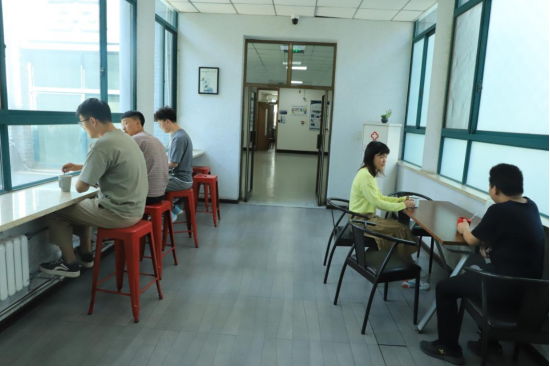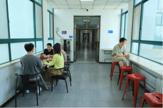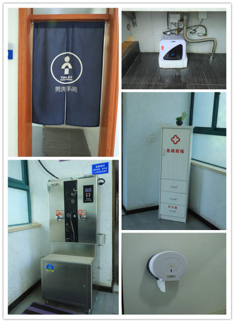 过去的卫生间,师生在冬天不得不忍受用冰冷的水洗手,现在,卫生间内安装暖水宝,保证师生在洗手时感受到学院关怀的“温度”。在卫生间入口处提供卫生纸供给处,方便师生取用。学院在每个楼层两侧连廊都放置了桌椅,配齐了热水器,为师生在交流讨论的同时还提供饮用水。在每个讨论区的角落斗柜中配备了应急药箱和灭火毯,保证师生能在第一时间对紧急情况进行处理。