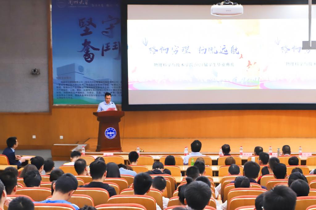 学院教师代表刘奇明以“情谊、成长、期待”为主题,希望毕业生们珍惜彼此友谊,心怀感恩之心,在未来的勤学中感悟“成长之道”,在未来的创新中培育“栋梁之才”。刘翰、郭文帝分别代表本科毕业生和研究生毕业生分享了个人的成长感悟,回忆了在兰大求学的美好时光,表达了对学校和学院的感激之情,他们表示,兰大扎根西部的淡定稳重以及服务国家的热血情怀已然成为毕业生学子们走向社会的最宝贵精神财富。本科毕业生物理学基地一班樊知宇家长樊湘东先生代表学生家长发言,他表示,毕业生们取得如今的成绩离不开学校、学院的培养和老师们的辛勤付出,毕业典礼不是终点而是人生新的起点,他勉励大家不忘初心、怀揣理想、坚定信念、直面挑战,走向人生更高的发展平台。