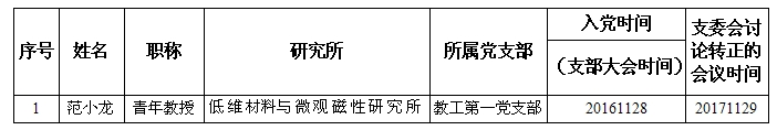 学院教工第一党支部于2017年11月29日召开支委会议,讨论本支部范小龙同志预备期满按期转正的问题,现对预备党员按期转正进行公示。