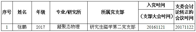 学院研究生磁学第二党支部于2017年11月22日召开支委会议,讨论本支部张鹏同志预备期满按期转正的问题,现对预备党员按期转正进行公示。