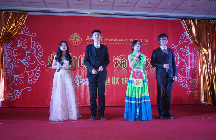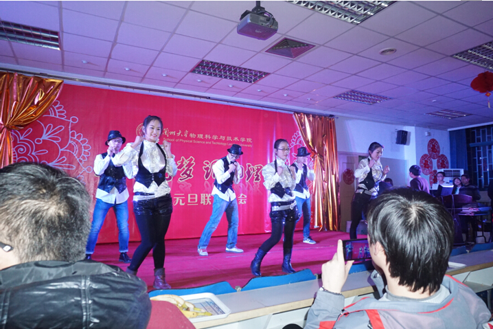 火红的灯笼,彩色的气球,惟妙惟肖的手工剪纸将会场装点得温馨喜庆,洋溢着新年的热闹气氛。晚会在彝族舞蹈《七月火把节》中拉开帷幕。四位主持人在全场观众热烈的掌声中宣布“追中国梦?诵物理情”2015元旦联欢晚会正式开始。激情的演唱、火热的舞蹈、风趣的小品、精彩的钢琴弹奏……各类节目轮番上映,现场气氛热烈,笑声不断。吉他弹唱《启程》唱出了青春的澎湃,男女对唱《美丽的神话》让大家耳目一新,钢琴独奏《土耳其进行曲》与小合唱《花样年华》更是将欢乐与感动分享给观众,活力四射的双人舞和热情奔放的拉丁舞让晚会现场欢呼声此起彼伏,小品《应聘》和相声《研究生生活》讲述了研究生生活过程中的所思、所悟,风趣幽默,令人捧腹,博得满堂彩。除此之外,“击鼓传花”、“你划我猜”、“趣味问答”等多个互动游戏让台上台下联成一片,所有师生都放松了心情,参与到晚会中来。最后,物理院独特的《小苹果》舞蹈将晚会推向了高潮,晚会在欢快的旋律中落下了帷幕。