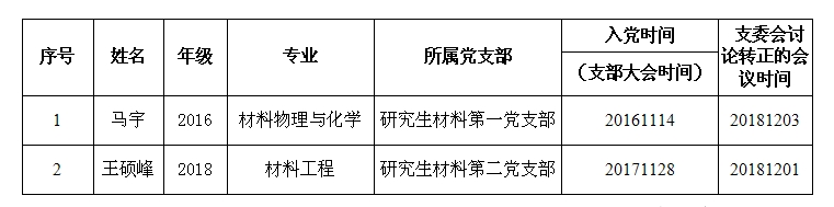 学院研究生材料第一党支部、材料第二党支部分于2018年12月3日、12月1日召开支委会议,讨论本支部预备党员的按期转正问题,现对预备党员按期转正进行公示。