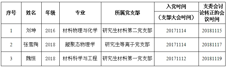 学院研究生材料第一党支部、等离子党支部、材料第二党支部分别于2018年11月15日、11月17日、11月19日召开支委会议,讨论本支部预备党员的按期转正问题,现对预备党员按期转正进行公示。