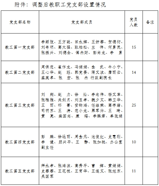 为进一步适应事业发展和中心工作需要,切实发挥党支部在教育、管理、监督党员和凝聚、服务、宣传和团结师生方面的作用,经研究,对我院教职工党支部设置做如下调整: