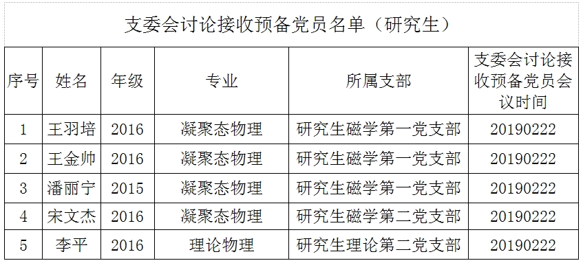 学院研究生各党支部于2019年2月22日,召开支委会议,决定接收王羽培等5名同志为预备党员,现对以下同志进行公示。