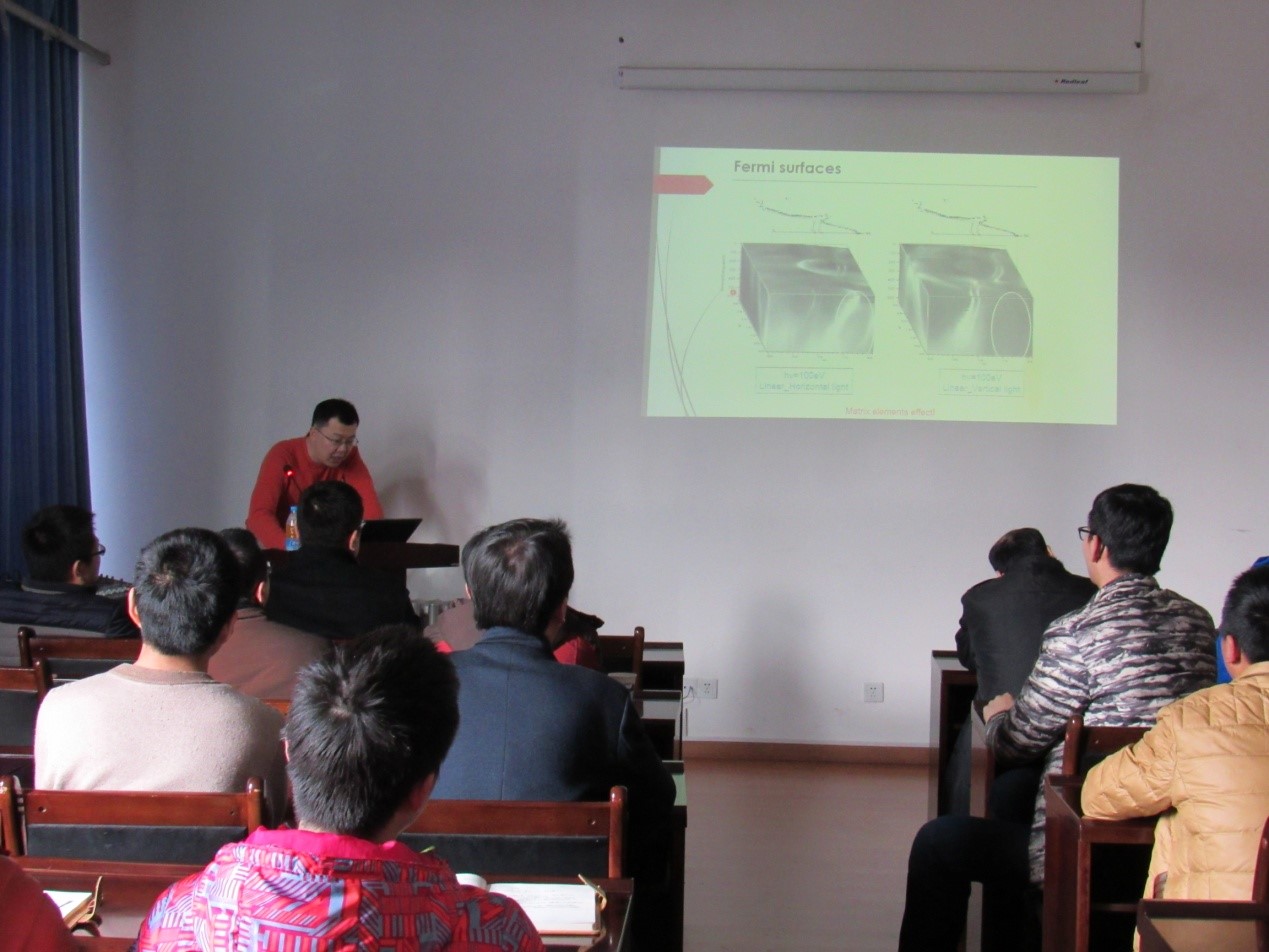 在报告中,崔教授详细介绍了高分辨角分辨光电子能谱(High resolution ARPES)的原理及其在固体电子结构探测中的独特优势;并以铁、镍等过渡金属单晶和铁掺杂的过渡金属二硫化物为例,展示了该技术在观测多体强关联系统中准粒子对费米面的影响,以及过渡金属掺杂对硫化物二维半导体材料带隙调制的研究中所取得的研究成果。通过这次报告,我院参会师生了解了High resolution ARPES技术在研究固体电子结构中的强大能力及其所能解决的实验问题,并有望将这种尖端实验测试技术应用于自己的科研工作中。