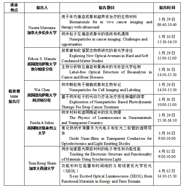 讲座交流内容以纳米材料研究进展为主,涉及纳米发光材料在生物标记、光动力疗法、器件合成与分析等诸多方面的应用,面向全校师生及物理、化学、材料科学相关人员。讲座具体安排如下: