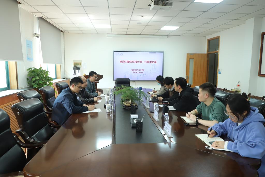 3月29日下午,内蒙古科技大学分析测试中心主任李永峰、理学院副院长马永红、教师代表邓磊波一行来到物理学院进行访问交流。学院副院长刘玉孝、王建波、研究生秘书杜艳芳、本科教学秘书范正焜、焦巧会出席交流座谈会。会议由王建波主持。
