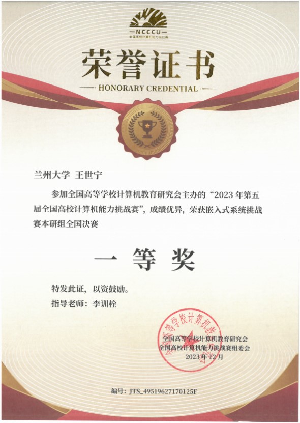 为培养具有完整的知识结构、较强的实践能力和突出的创新意识人才,学院鼓励教师指导学生参加考核综合知识和实践能力的竞赛,培养学生的创新意识和创新能力。2023年12月,物理学院2021级微电子科学与工程专业本科生王世宁在李训栓高级实验师的指导下,荣获2023年第五届全国高校计算机能力挑战赛嵌入式系统挑战赛本研组全国决赛一等奖。