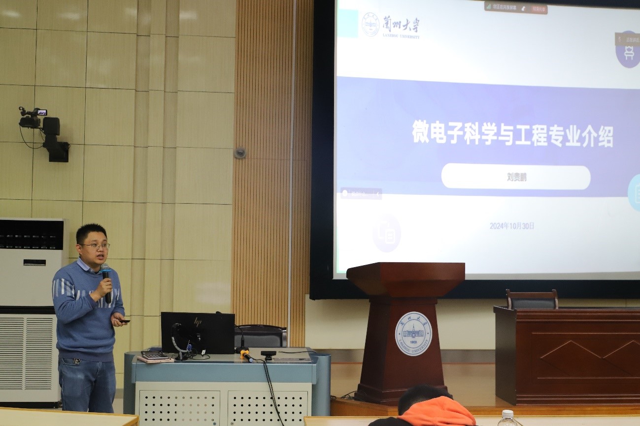 紧接着,刘贵鹏副教授对微电子科学与工程专业进行了介绍。他指出兰州大学作为全国最早拥有微电子专业的八所高校之一,目前已形成了从本科到博士、从学术学位到专业学位的教学、科研人才培养体系;随后他围绕微电子科学与工程专业的学习要求和发展前景进行讲解;最后详细解读了微电子科学与工程专业的人才培养方案,提醒同学们尽早做好学业规划,培养自学能力、创新能力。