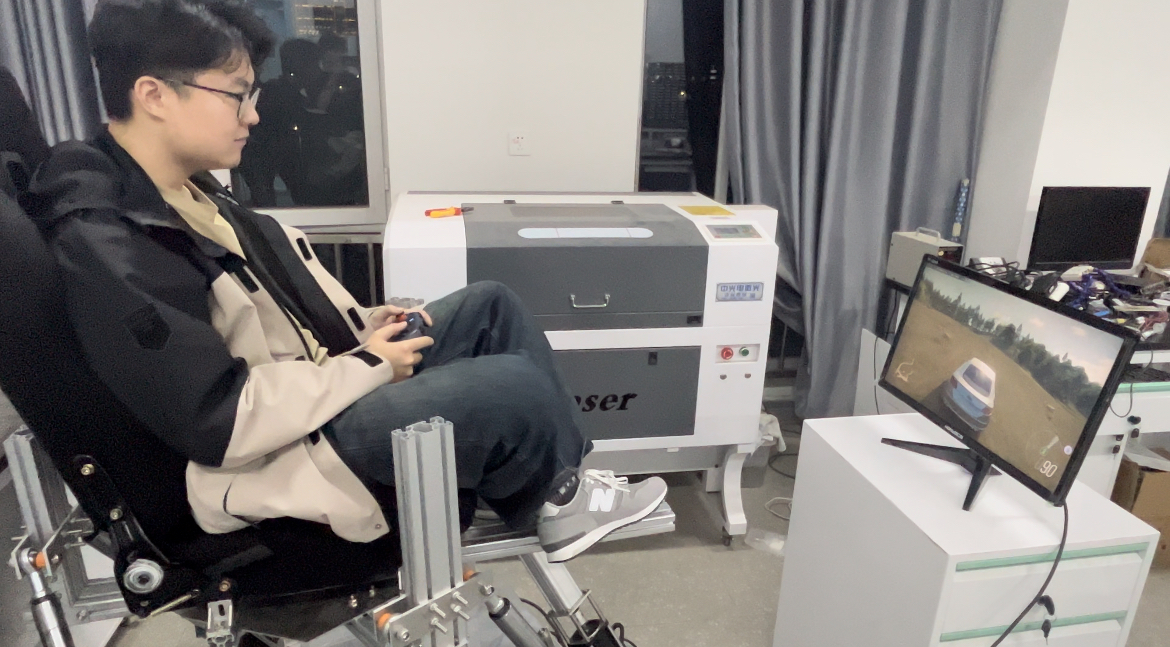 该参赛作品由学院李训栓高级实验师指导,是一款基于斯图尔特平台的能够提供体感力反馈的游戏系统。该系统的主体为力反馈座椅,由六根团队自主设计和搭建的电缸组成,使用MEGA2560开发板进行伺服电机的控制,同时在上位机中可进行虚拟游戏的数据采集以及算法处理,最终通过串口通信实现数据的传输,让虚拟赛车游戏中的真实体感还原到现实世界的力反馈座椅上,这样的游戏系统由团队自主设计和搭建,很大程度上降低了动态赛车模拟器的成本同时保留了良好的力反馈体验。在准备过程中,参赛队员之间分工明确,协作紧密,他们共同攻克技术难关,不断优化作品,最终呈现出了一部令人惊艳的数字媒体科技作品。