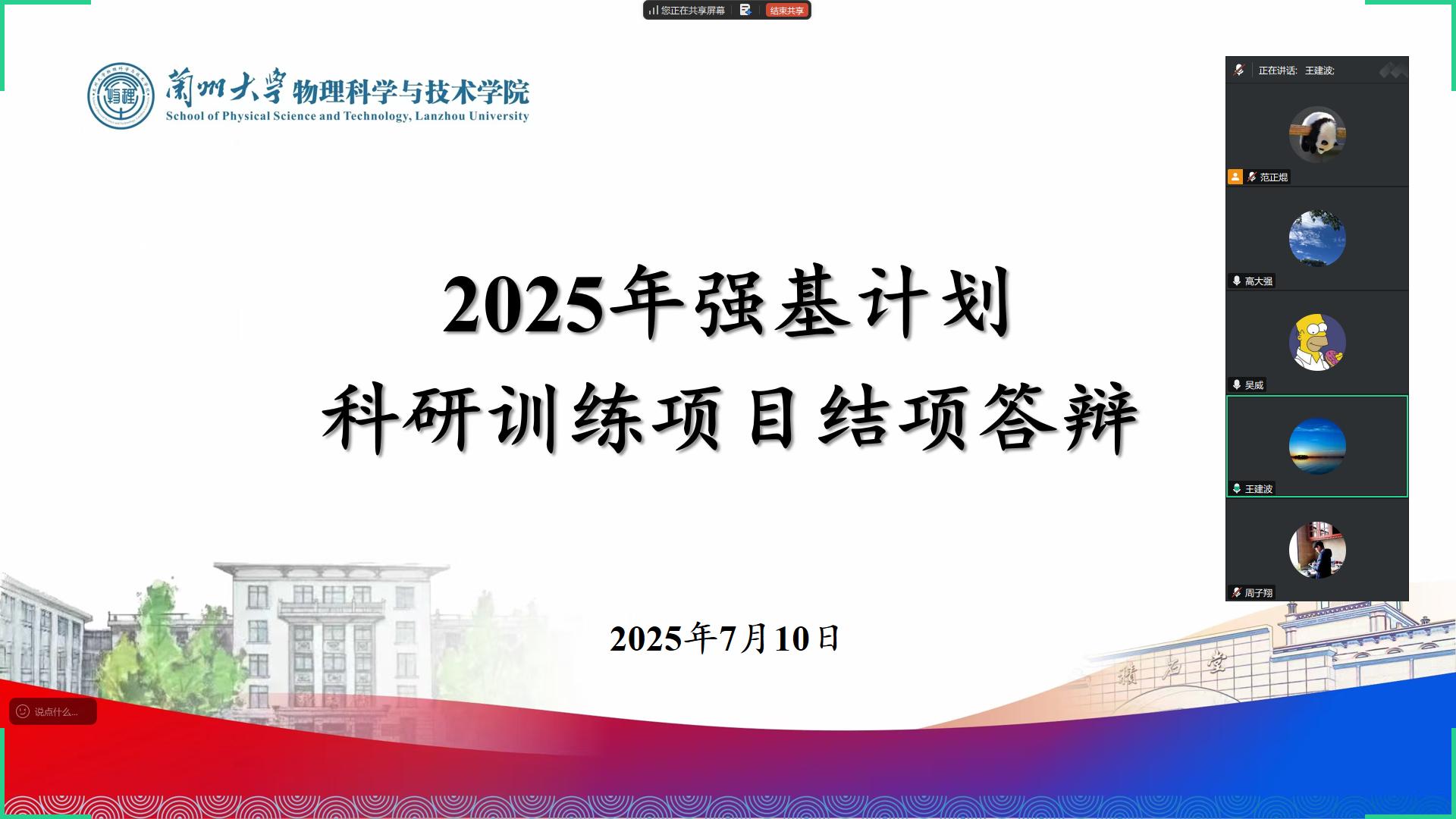 为检验学生在基础学科研究中的实践能力与创新思维,为强基计划人才培养体系的优化提供实践依据,物理学院于7月10日上午组织开展2025年强基计划科研训练项目结项答辩评审工作,对2022级及2023级强基计划本科生的科研训练情况进行全面考核,王建波、高大强、吴威3位老师担任评委。