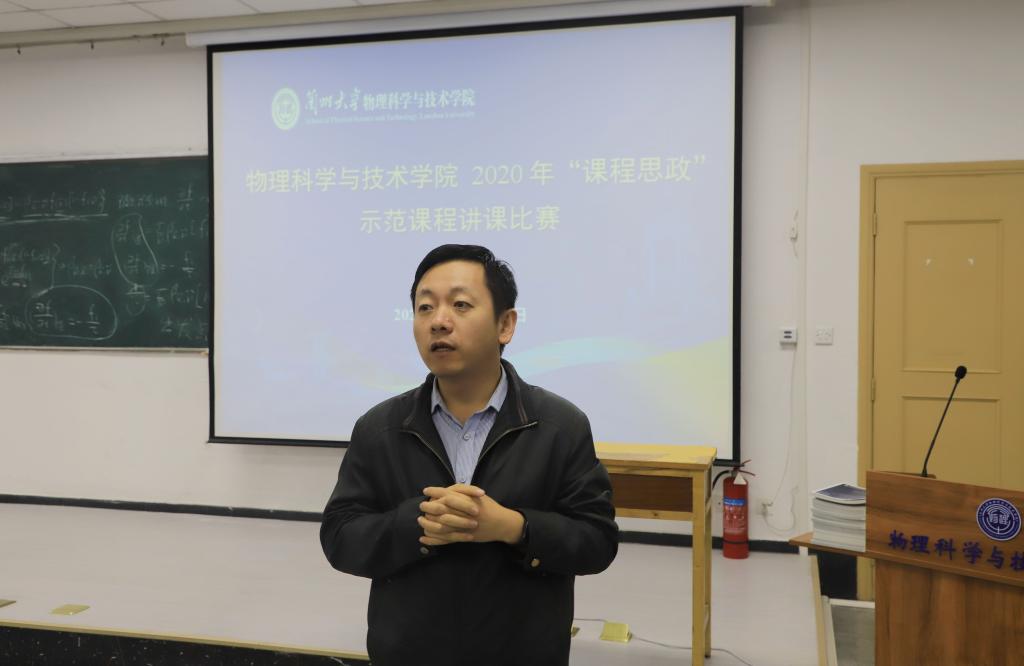 王建波代表学院向精心准备本次比赛的评委和参赛老师表达了衷心的感谢。他表示,引入“课程思政”的教育理念,旨在引导教师以课程为载体,以立德树人为根本,充分挖掘拓展各门课程思想政治元素,充分发挥各门课程的思想政治教育功能,切实把思想政治工作贯穿教育教学全过程,构建协同育人机制,从而提升学院人才培养能力,加快物理学院综合改革和一流学科建设的步伐。