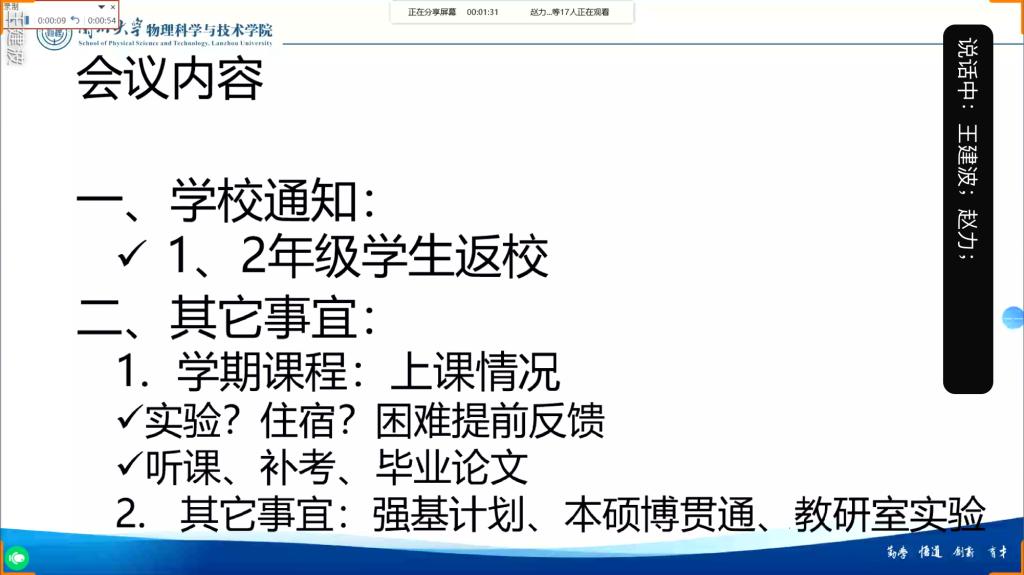 王建波详细通报了学校开云登陆入口学生返校工作的相关通知,就教学、实践、考试和毕业等方面,对学生返校后教学工作方案、课程安排调整、课堂教学组织管理等相关工作进行了周密安排。他指出,各教研室要做好返校教学工作的组织安排,根据课程教学大纲和线上教学情况,做好线上线下教学衔接,适当调整教学进度,优化教学策略,确保防疫到位、教学有序。会议还围绕本学期教学和教研活动、课堂教学、强基计划、本硕博贯通、教研室实验等教研室重点工作做了具体布置。