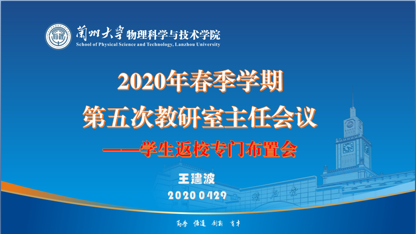 为进一步落实兰州大学疫情防控专题工作会议和本科教学工作例会会议精神, 安排布置2017级本科生返校工作,429日上午,物理学院借助QQ平台召开了2020年春季学期第五次教研室主任副主任会议。各教研室主任、副主任和教学秘书近30人参加会议。会议由教学副院长王建波主持。