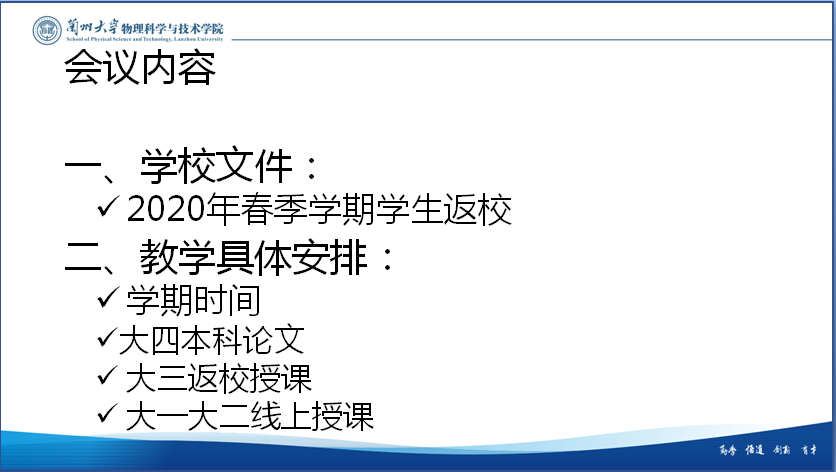 王建波从九个方面认真传达了兰州大学《开云登陆入口做好2020年春季学期学生返校工作的通知》。他指出,学生返校复课工作是学院当前最重要、最紧迫的头等大事,各教研室要高度重视常态化疫情防控、学生返校和教育教学工作,强化责任担当、按照学校开云登陆入口开学工作有关要求,认真落实学校安排部署,充分考虑学生的实际情况,落实落细疫情防控各项要求,加快恢复教学科研等工作。