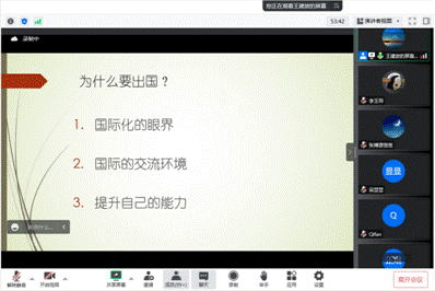 杨秀珺从当前国际形势及出国(境)交流政策、学生出国(境)交流总览、交流项目介绍、申请常见问题解答等方面进行了详细的解读。她指出在当前国际形势错综复杂以及新冠肺炎疫情影响下,我校人才培养国际化面临严峻挑战,为应对各种风险挑战,我校统一思想、集中力量,从政策引领、经费支持、全域动态化管理、“双一流”学科个性化定制等方面入手,多管齐下助力学生出国(境)交流。