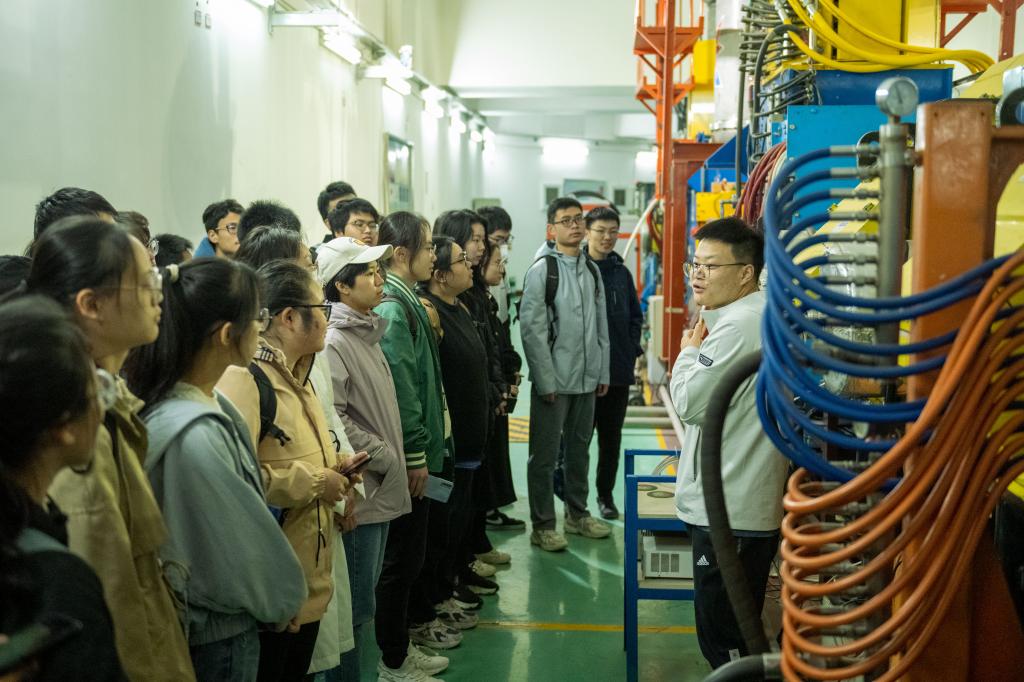 在近物所博士生王磊的带领下,同学们参观了重离子加速器国家实验室,对重离子加速器的局部构造进行了深入了解,王磊对加速器的构造、运行方式、应用领域等做了介绍,通过近距离观看,同学们对实验仪器有了更直观的感受,增强了科学探究的兴趣。