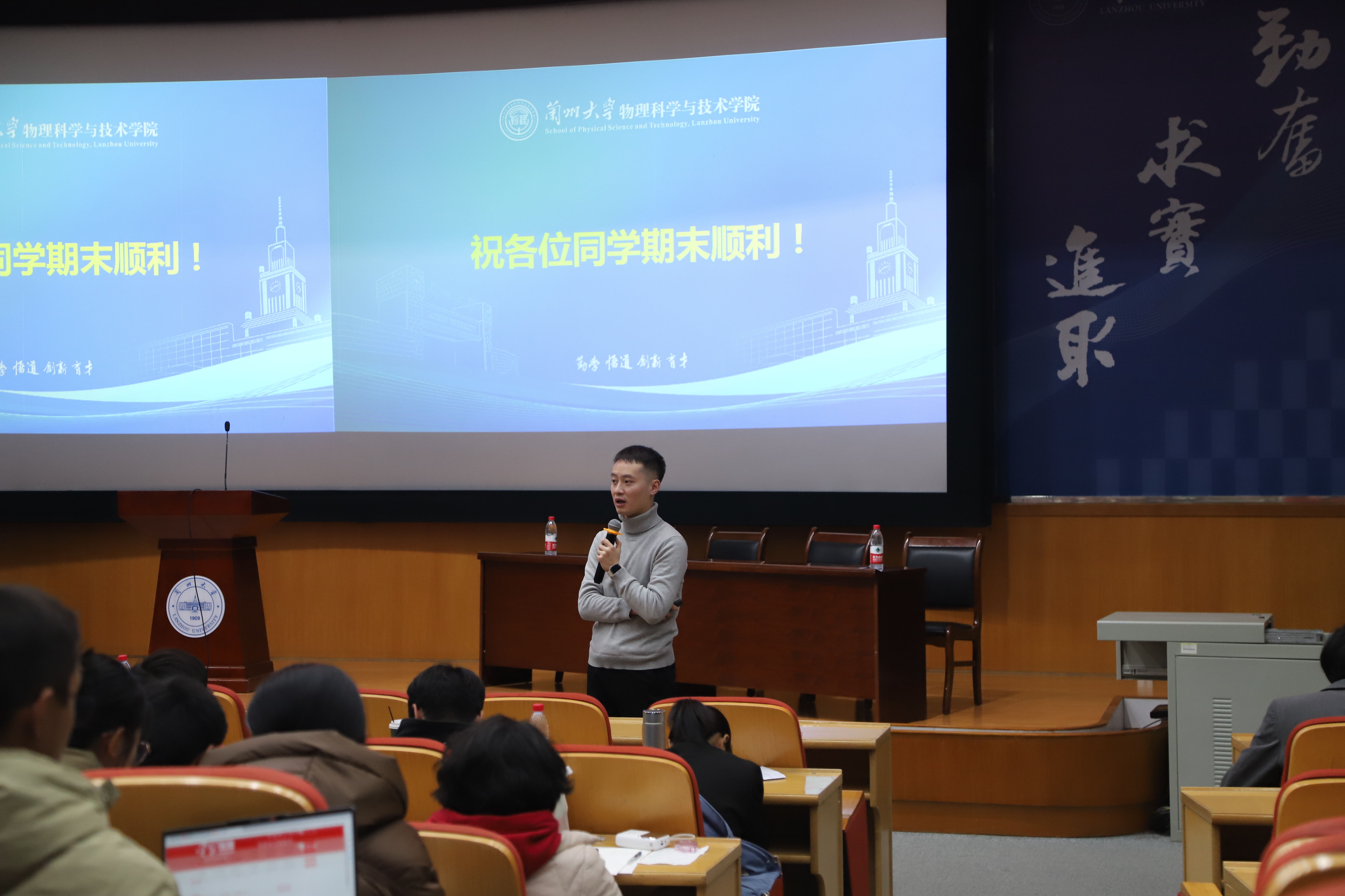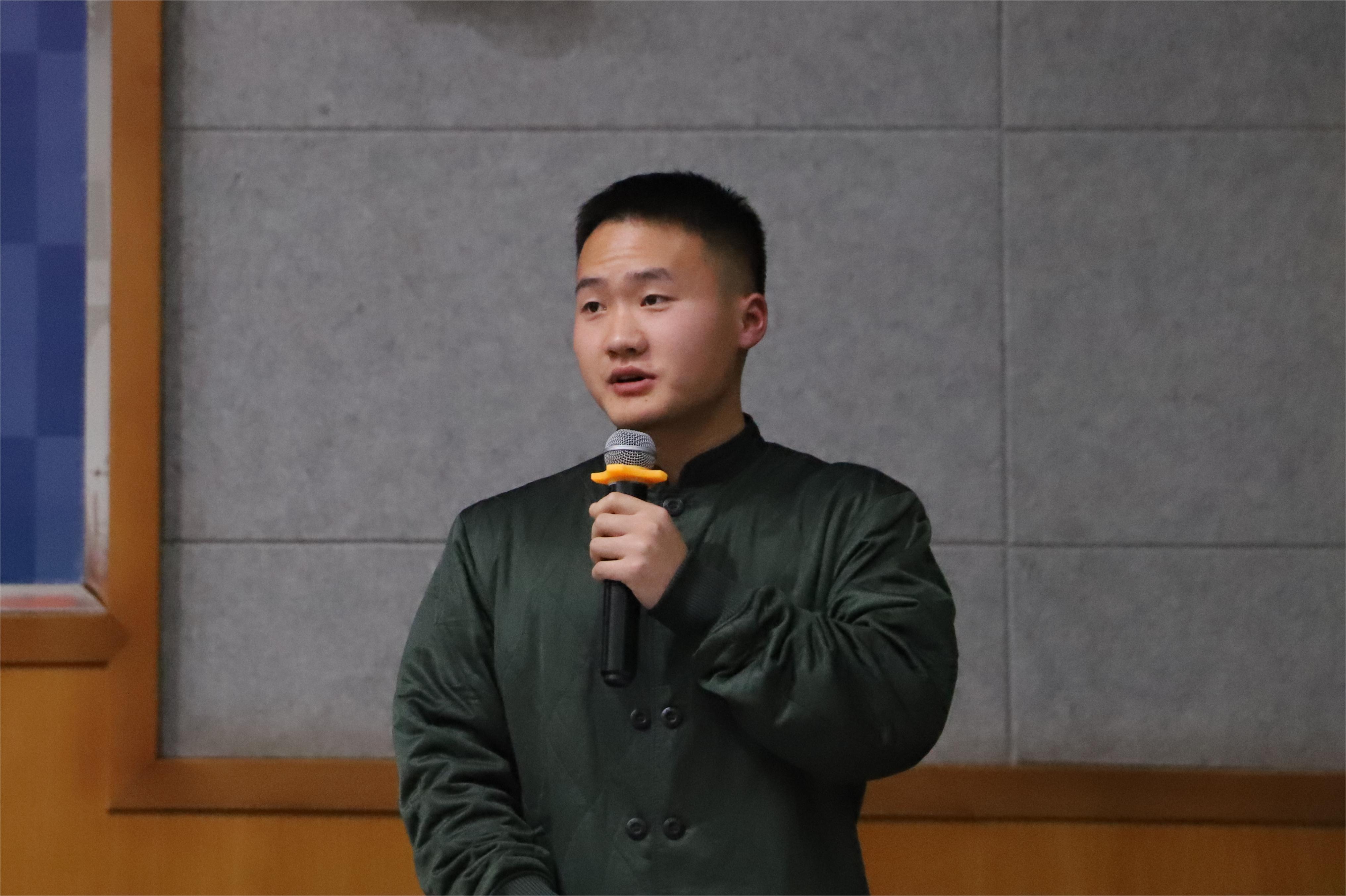 2023级物理类5班谭汀铭讲述了参军入伍两年的经历和成长,分享了自己的军营生活和参军过程中的心得体会,号召同学们踊跃参军。张明华在会上详细介绍了兰州大学参军入伍优惠政策,鼓励同学们携笔从戎,投身军旅。