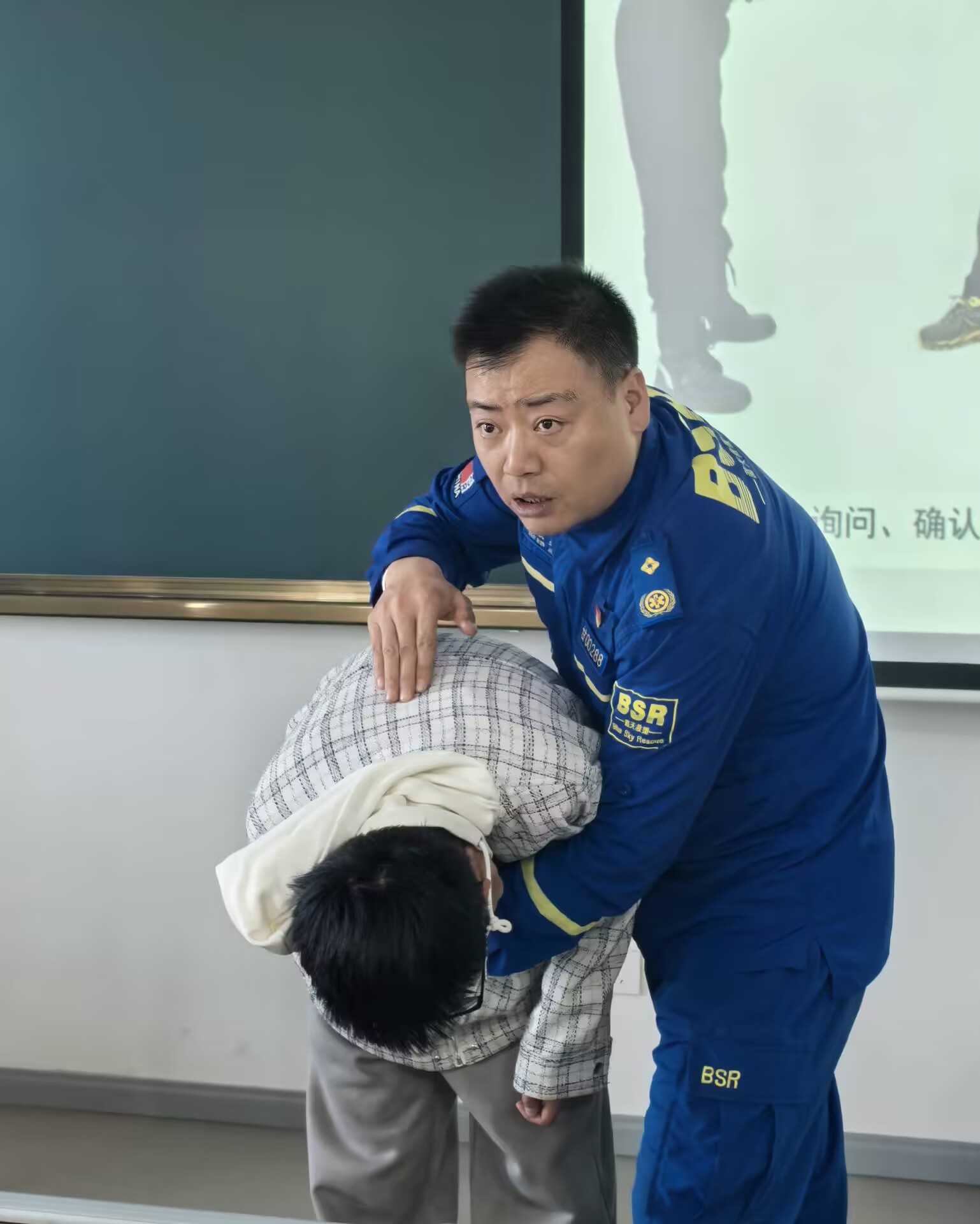 薄文杰围绕气道梗塞和心搏骤停两大主题,通过理论讲解和操作演示相结合的方式,详细介绍了相关的急救知识和方法,为同学们带来了一堂生动的应急救护课。薄文杰首先对气道梗塞的原因进行了讲解,随后,薄文杰结合道具介绍应对气道梗塞的海姆立克急救法,并分步演示了成人和儿童在遇到气道梗塞时的急救操作。在讲解心搏骤停相关知识时,薄文杰结合近几年的实例,强调了心搏骤停的严重性。紧接着,他详细讲解了心搏骤停的急救手段,并介绍了自动体外除颤器的使用方法。