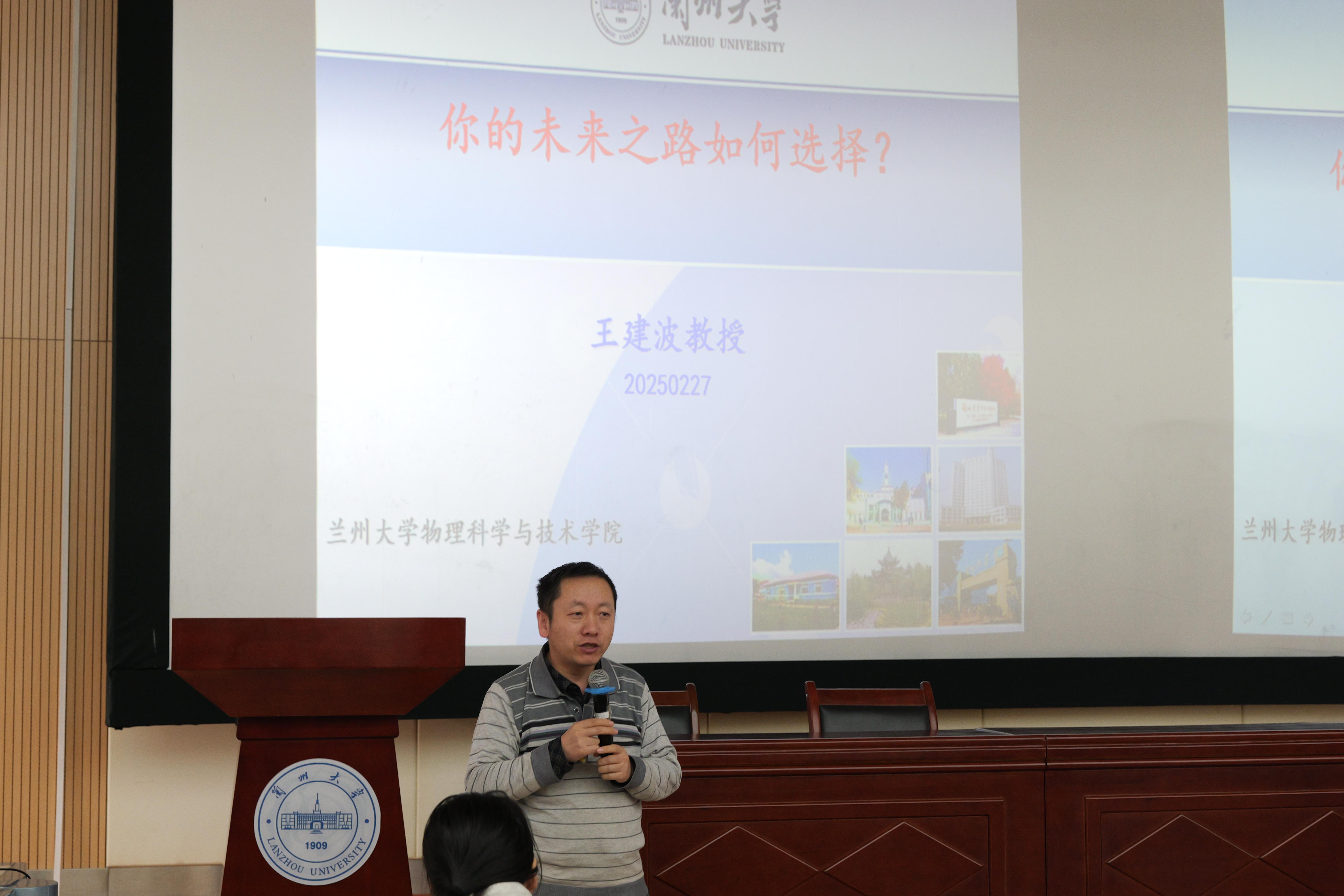 王建波以“未来之路如何选择”为主题,就学业发展与生涯规划问题和同学们进行了深入交流。他指出,同学们在面对多种选择时可能会感到迷茫,但努力和奋进是通向成功的唯一途径,要坚定信念、积极创新、脚踏实地、关注国家需求并保持开放心态,将个人发展融入国家大局之中,为实现中华民族的伟大复兴贡献力量。