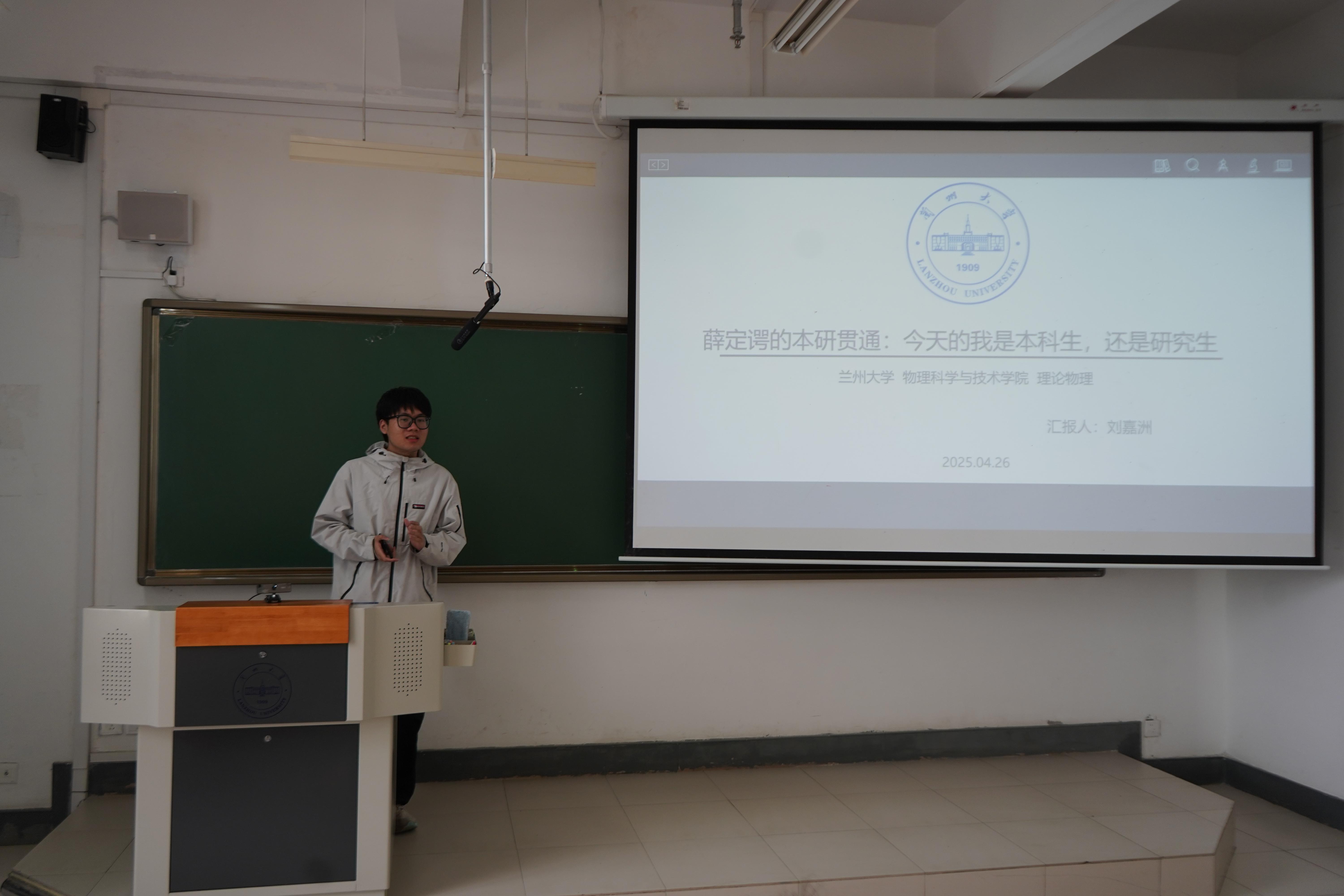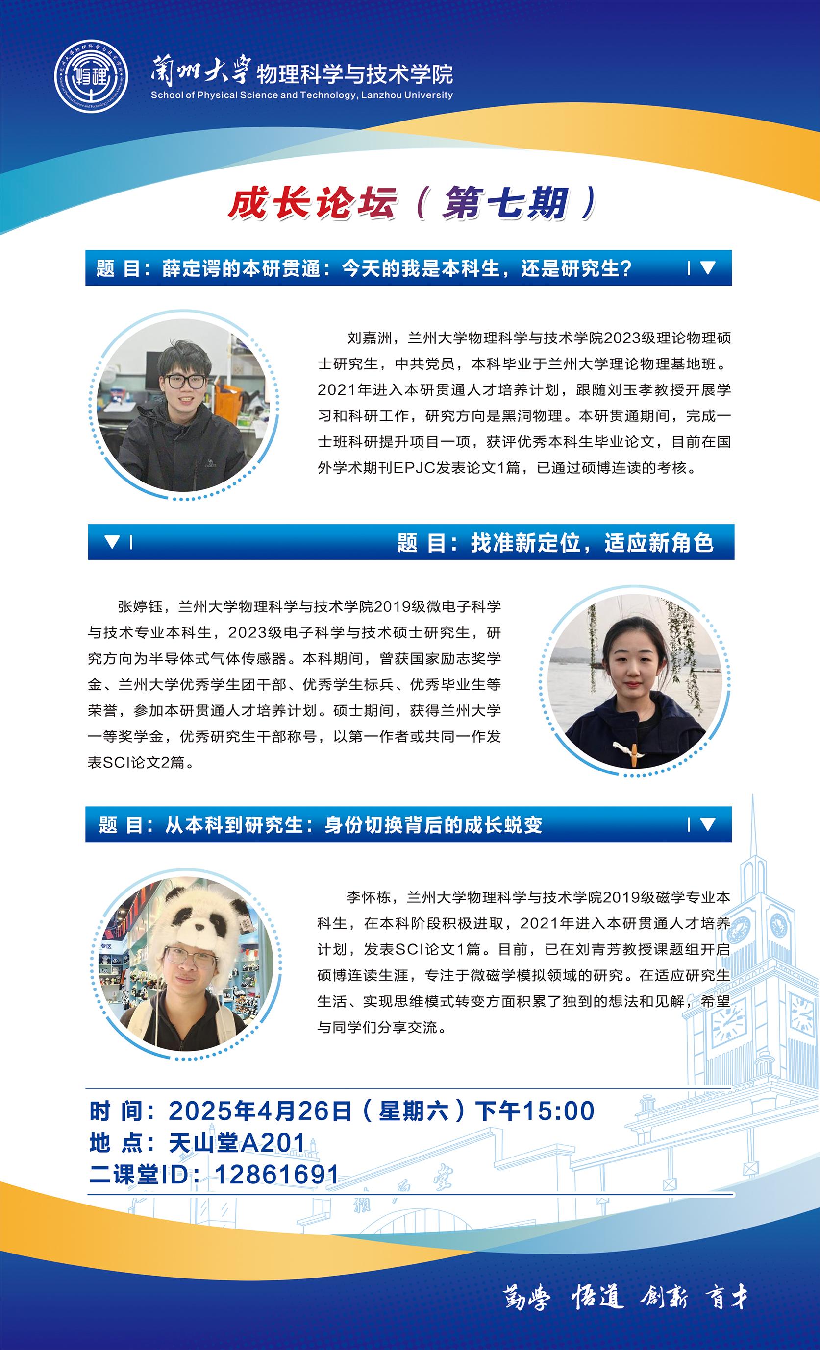 为帮助本科生提前了解研究生学习科研和日常生活情况,引导学生科学制定职业生涯发展规划,4月26日下午,物理学院在天山堂A201举行第七期“成长论坛”,学院学业发展中心、“格物穷理”学业指导工作室邀请了学院第一批本研贯通人才培养计划的三名同学进行分享。会议由学院兼职辅导员代天强主持。