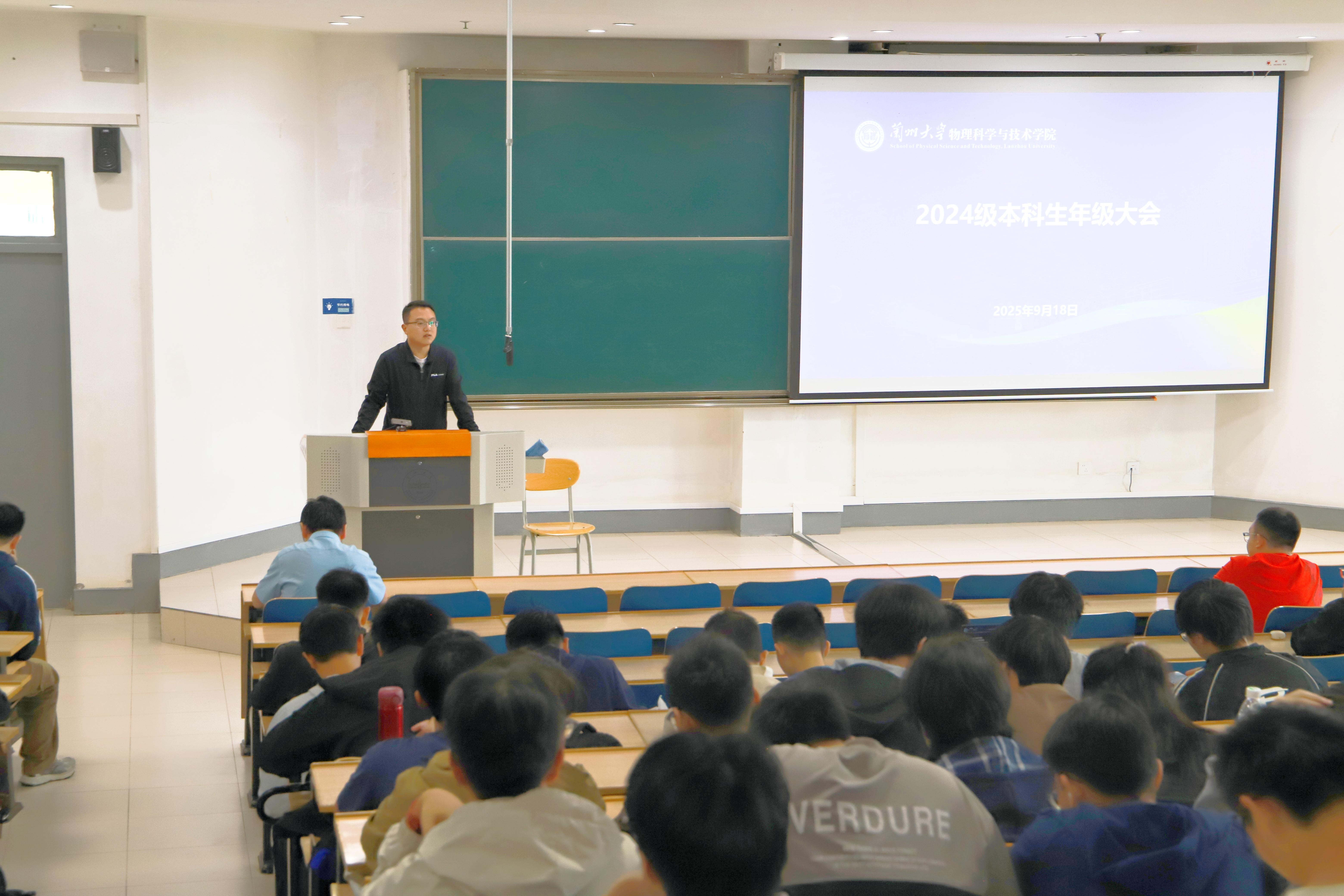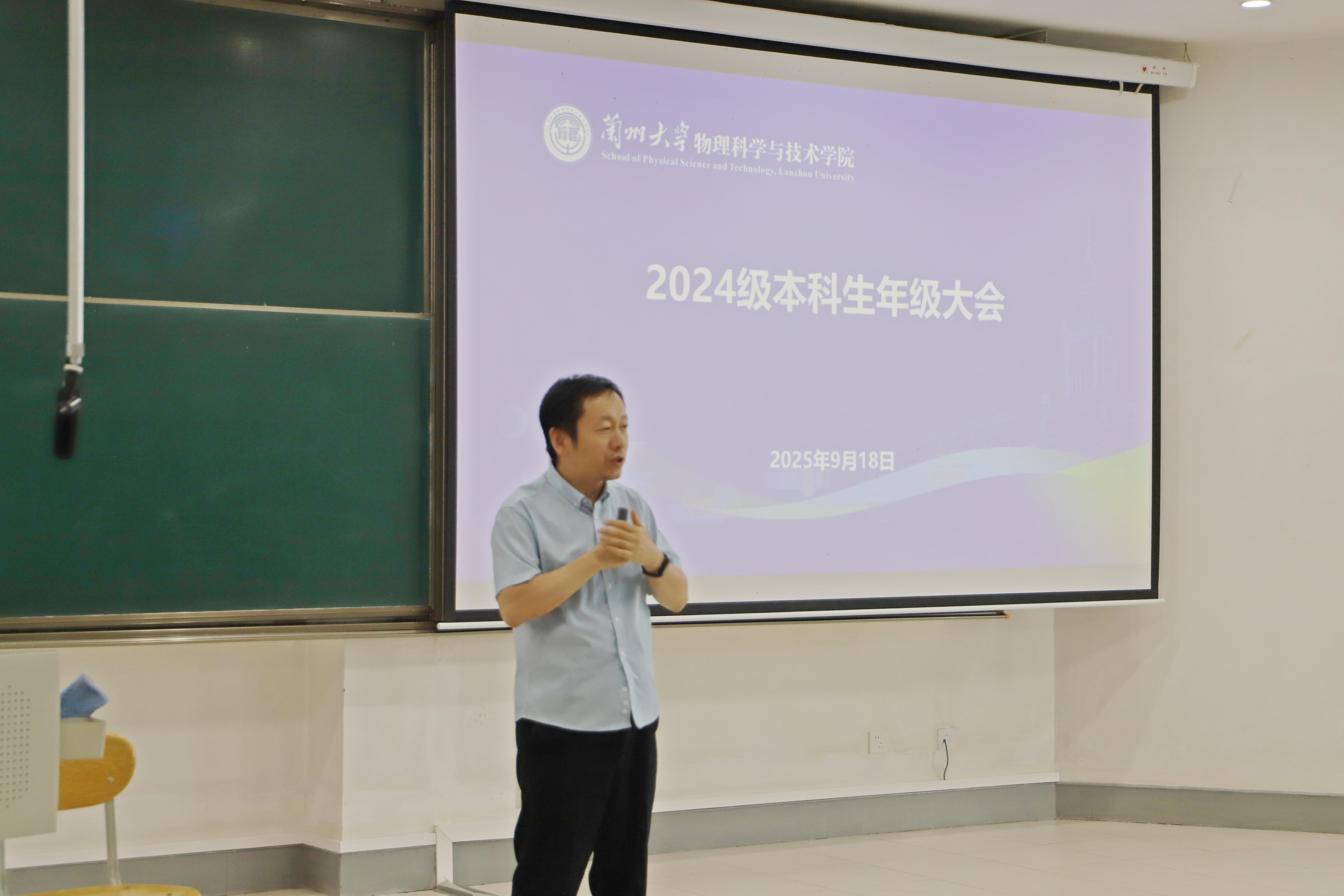 9月18日下午,物理学院在榆中校区天山堂C203召开2024级本科生年级大会,学院副院长王建波、2024级本科生辅导员樊金雷、兼职辅导员党驰源和2024级全体本科生参加会议。会议由樊金雷主持。