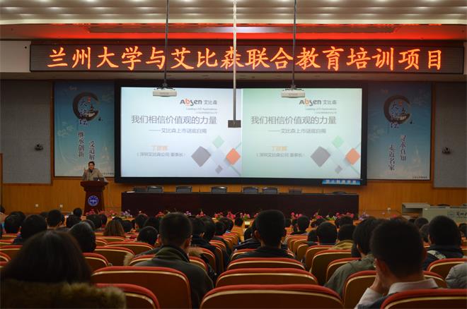 12月3日晚,深圳市艾比森光电股份有限公司董事长丁彦辉先生来到兰州大学举办了题为《我们相信价值观的力量》的演讲,向同学们介绍了艾比森的企业文化,同时介绍了即将开办的艾比森班的相关情况。物理学院党委书记石兆俊、党委副书记李鹏君、团委书记陈洁、团委副书记高尚、辅导员马俊以及来自全校的200余位同学到场聆听了本场演讲。