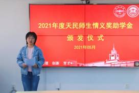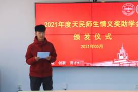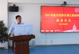 会上,李星波介绍了天民师生情义奖助基金捐赠情况和财务收支情况,表达了对所有爱心捐助人士的感谢之情。王岩介绍了本年度天民师生情义奖助学金评定工作相关情况,宣读了受奖助学生名单,他表示,在广大校友的持续关怀和支持下,学院本科生在学术竞赛、科研创新、文娱体育等方面均取得了良好的成绩,他希望受助学生铭记以王天民教授为代表的兰大人的爱心和善举,自强自立,脚踏实地,刻苦学习,不断提高自己的道德素养、文化水平和专业技能,努力使自己成为优秀的当代大学生,用实际行动回报母校、回报社会、回报祖国。与会嘉宾和老师为受奖助学生代表颁发了获奖证书。