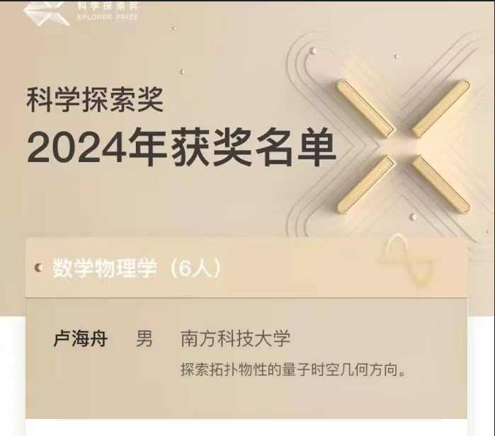 8月26日,2024年(第六届)“科学探索奖”获奖名单公布,49位青年科学家榜上有名。物理学院1998级校友、南方科技大学教授卢海舟获此殊荣。