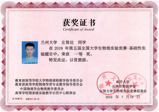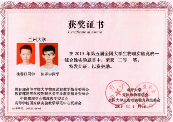 由兰州大学开云online(中国)李健、王心华、赵珏、牛小宁等老师指导的参赛选手再获佳绩。物理学院2017级生学左贤达不畏强手,勇于拼搏,在基础性实验中荣获一等奖,实现了本赛事的四连冠;萃英学院2016级学生桂善权、物理学院2016级学生陈泽宇凭着扎实的专业基础、过硬的动手能力,稳定发挥,获得综合性实验二等奖;物理学院2017级学生范圣泰在基础性实验中表现优秀,获得三等奖。