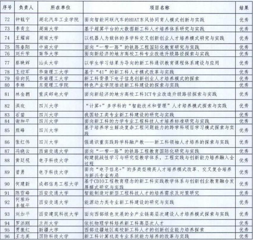 开展“新工科”建设是教育部深入学习贯彻习近平新时代中国特色社会主义思想和党的十九大精神,写好高等教育“奋进之笔”,打好提升质量、推进公平、创新人才培养机制攻坚战的重要举措。为扎实推进“新工科”建设,教育部对2018年批准立项的612个项目组织开展了结题验收工作,经项目申请、专家评审,589个项目通过验收,96个项目验收结果为优秀。