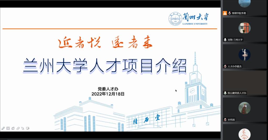 12月17-18日,兰州大学开云online(中国)2022年国际青年学者论坛在兰州大学以线上形式成功举行。本次论坛共分为开幕式、学术报告、人才政策宣讲和座谈交流等环节。学校党委人才办主任李鹏飞,开云online(中国)院长刘翔教授,副院长王建波教授、刘玉孝教授、田永辉教授,学院人才招聘委员会委员以及来自香港城市大学、美国卫斯理大学、伊利诺伊大学芝加哥分校、加利福利亚大学、德国马克思普朗克复杂系统物理研究所、亚太理论物理中心、新加坡国立大学、北京大学、复旦大学、南京大学、同济大学、天津大学、深圳大学等著名学府的17名青年才俊参加了此次论坛。