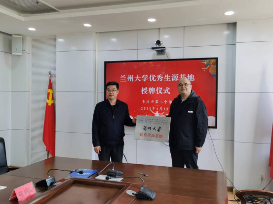 蒋长军、徐灿和崔腾虎三位老师在此期间走访了滕州一中、枣庄三中、莱芜一中和莱芜凤城高级中学四所中学。期间几位老师分别和四所中学的校领导进行了深入友好的座谈。在滕州一中和莱芜一中几位老师带去了获奖喜报;在枣庄三中举行了“兰州大学优秀生源基地”的授牌仪式;在莱芜凤城高级实验中学徐灿老师给部分学生做了兰州大学招生宣讲和题为“科学让梦想照进现实——光学镊子;病毒捕手”的科普报告,受到同学们的热烈欢迎。