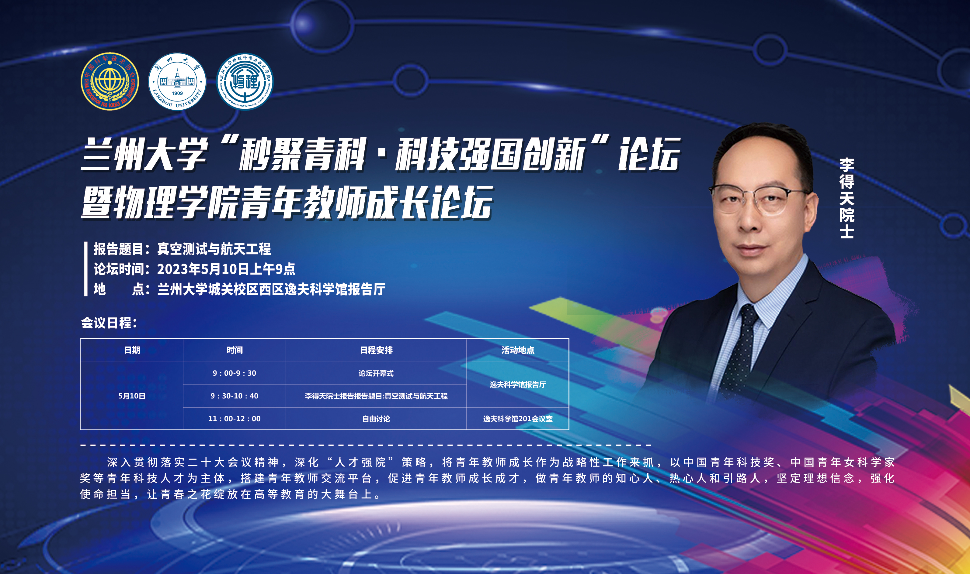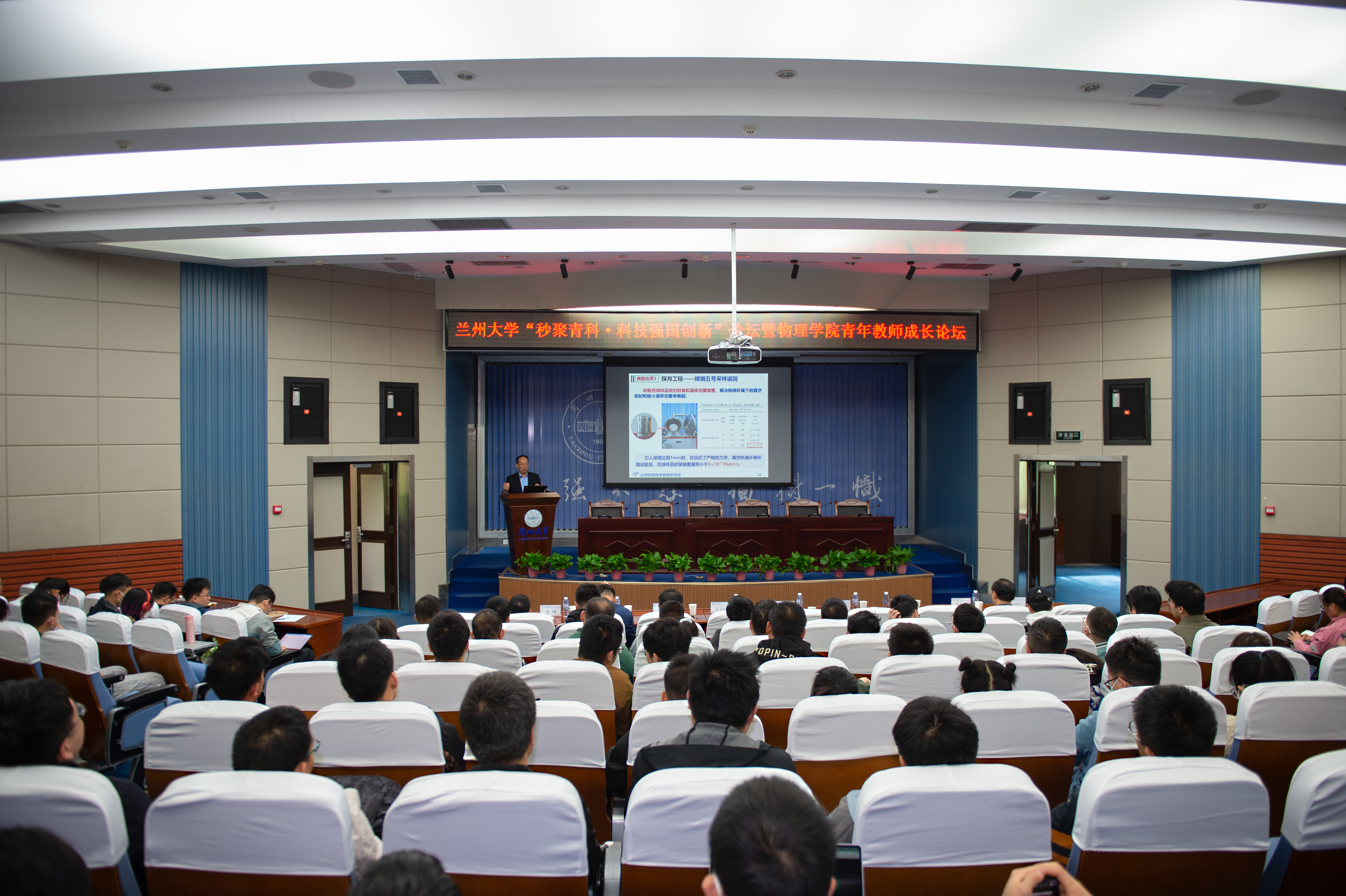 5月10日,兰州大学“秒聚青科·科技强国创新”论坛暨物理学院青年教师成长论坛在兰州大学城关校区西区逸夫科学馆报告厅举行。活动由中国科学技术协会组织人事部、甘肃省科学技术协会主办,兰州大学开云online(中国)承办,活动邀请中国工程院院士、国际宇航科学院院士、兰州空间技术物理研究所科技委主任李得天研究员,中国青年科技奖获得者、中国科学院上海高等研究院邓海啸研究员,甘肃省科学技术协会一级巡视员张炯主席,兰州大学副校长范宝军,甘肃省科学技术协会组宣部副部长王瑾,兰州市科学技术协会党组成员、副主席柴军荣,兰州空间技术物理研究所科技委秘书长雷占许出席活动。