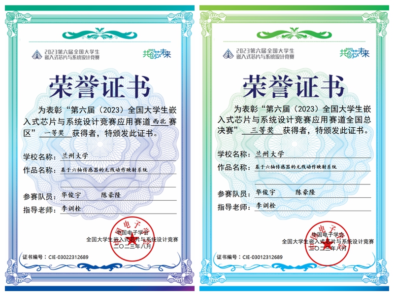 由物理学院2021级本科生陈豪隆和信息科学与技术学院2021级本科生华俊宇组成的“野生钢铁侠”队,在李训栓老师的精心指导下,共同努力、反复打磨、精益求精,不断试错和优化项目,呈现出4个高质量参赛作品,最终荣获佳绩。通过本次比赛,队员们深入学习了陀螺仪数据解析和收集、无线传输模块数据传输、3D建模和3D打印等知识,加深了对嵌入式设备的认识,熟悉了芯片设计、软硬件适配、系统优化、应用方案设计等不同技术层面的相关知识和技能,提高了解决实际问题和自主探究的能力。